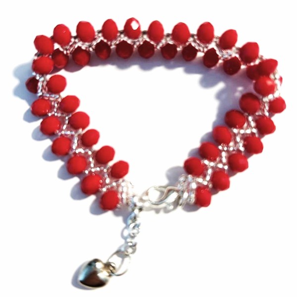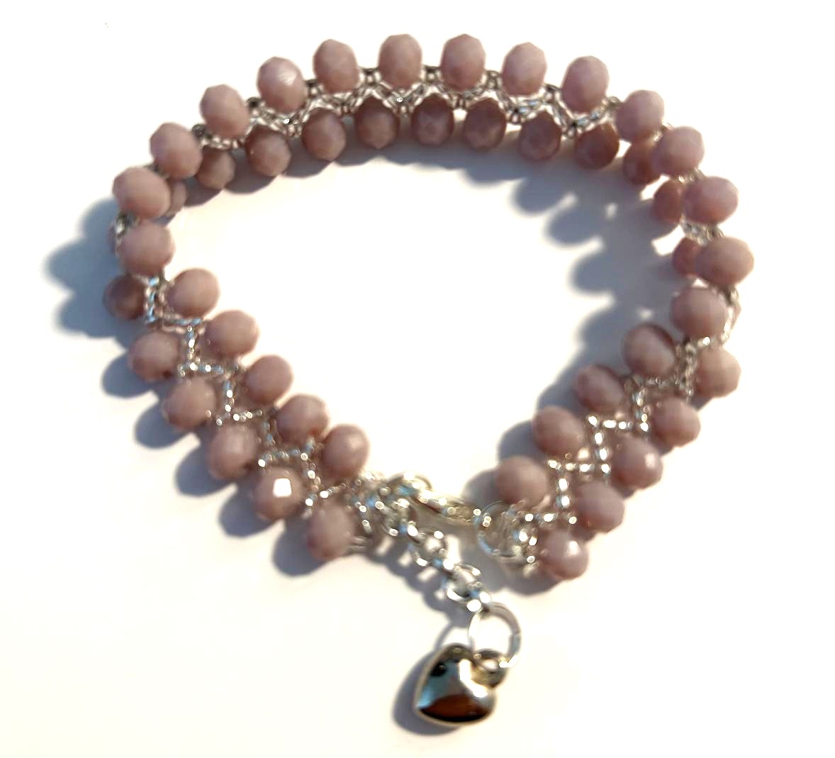The Bracelet is finished with lobster clasps matching the 1-mm-beads colour, and a handthreaded-wire chain with a charm at the end of the chain.