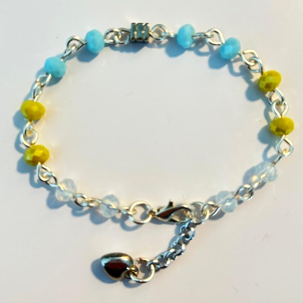 The Bracelet is finished with lobster clasps matching the chain colour, and a handthreaded-wire chain with a charm at the end of the chain.
